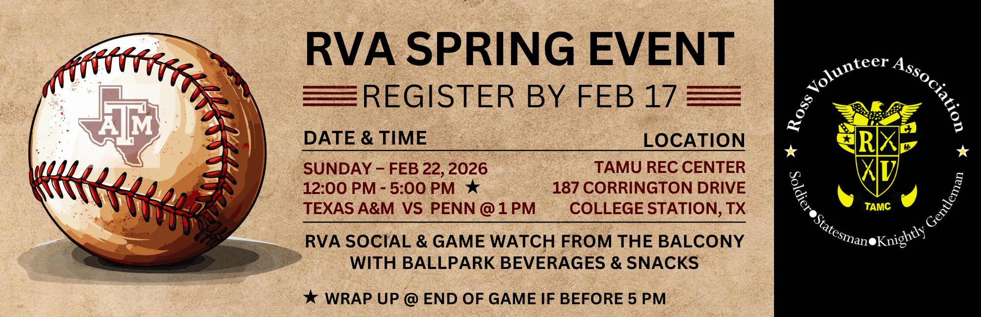 Registration is open! Join us for a baseball social and game watch from the Rec Center balcony (A&M vs Penn @ 1pm) and enjoy ballpark snacks, beverages, and bubbles!